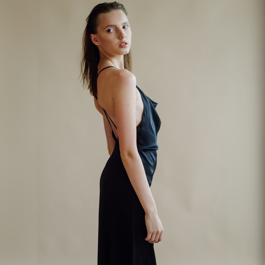 Avec sa coupe ajustée et son tissu fluide légèrement brillant, cette robe apporte une allure sophistiquée. Le décolleté profond et le dos nu en font une pièce incontournable pour vos évènements chics. À porter avec des talons pour un effet spectaculaire.